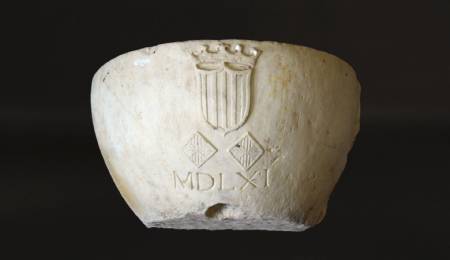 Two stoups probably from the chapel of the Casa Comunale di Oristano, characterised by the shield with Aragon poles and two coats of arms of Oristano.